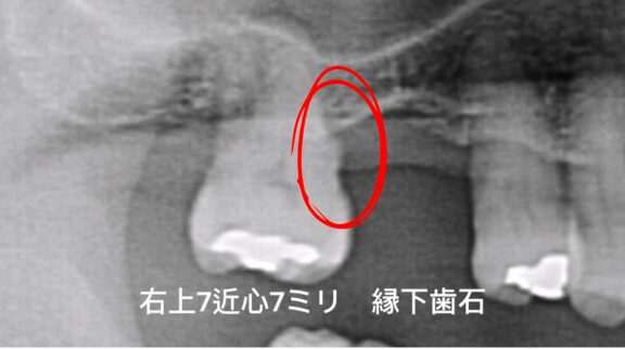 右上7番の近心根面に縁下歯石とみられる付着物があり、周囲の骨吸収も明瞭です。
